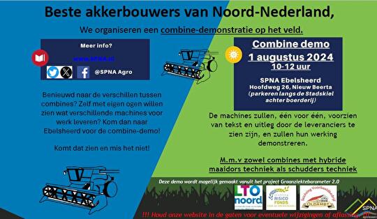 Inmiddels zijn de laatste dagen van juli aangebroken, en is het op veel plaatsen tijd om te combinen. Daarom is dit ook hét moment voor het organiseren van een combine-demonstratie op onze locatie Ebelsheerd. Een demonstratie van verschillende combines en - technieken om te laten zien wat ze kunnen betekenen voor een mooie oogst. U bent van harte welkom!