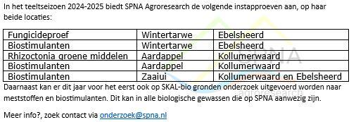 Ook in 2025 kan er weer ingestapt worden in diverse instapproeven die wij organiseren op de beide locaties. In onderstaande overzichten staan de mogelijkheden van middelen onderzoeken in de diverse gewassen.