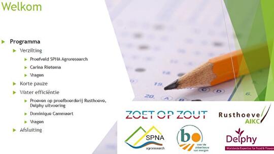 Op 14 maart 2024 stond het webinar 'Verzilting en water efficiëntie' plaats. Tijdens dit webinar ging SPNA Agrorearch in op de stand van zaken van het verziltingsproefveld op hun locatie de Kollumerwaard. Tevens stond er via proefboerderij Rusthoeve (Zeeland) een presenattie klaar vanuit Delphy waarin resultaten van het 3-jarige onderzoek naar het gebruik van veschillende druppel-/beregenings-methoden in uien werd besproken.